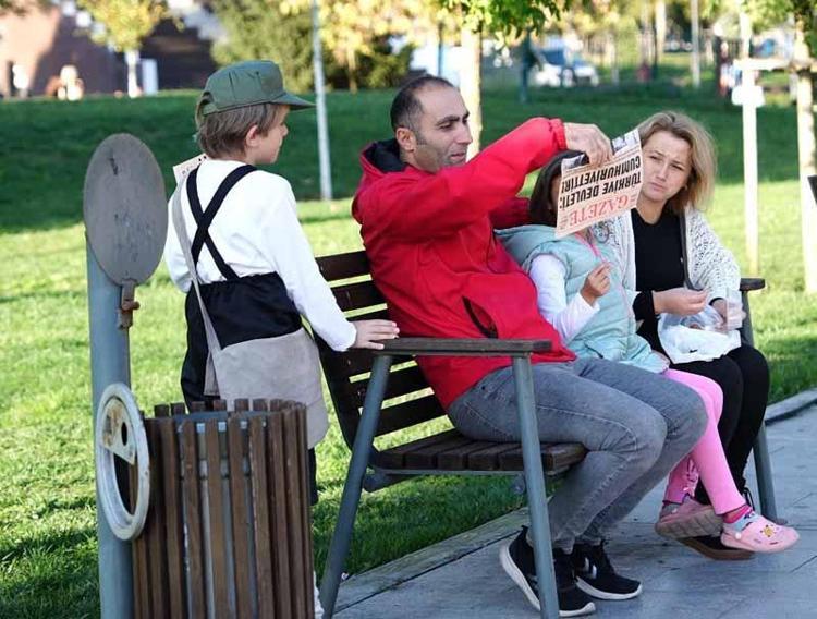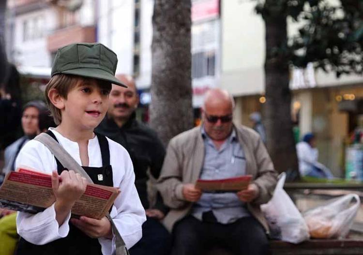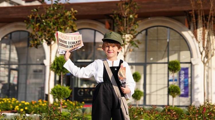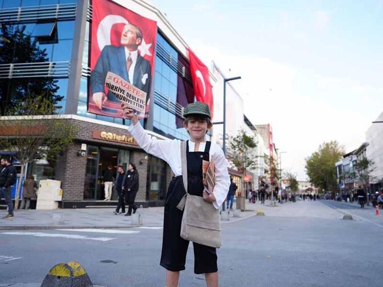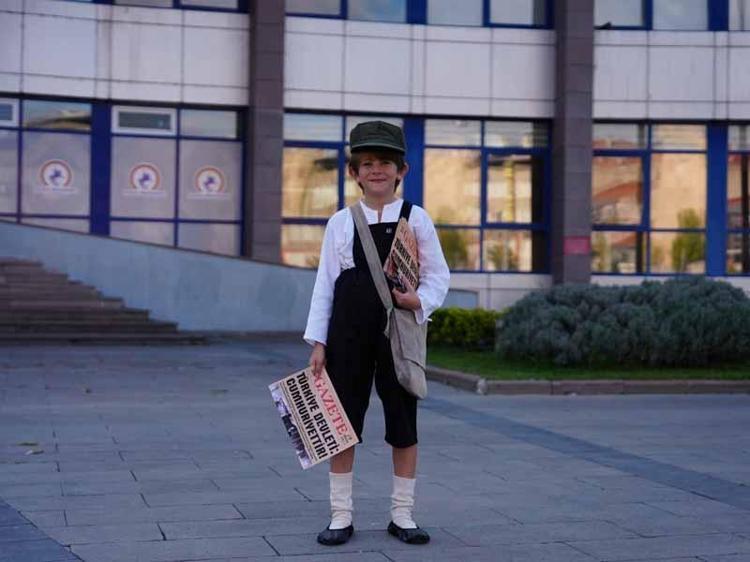 Dönemin kıyafetlerini giyen çocuk, 'Cumhuriyet’in ilanını yazıyor’ diyerek gazete dağıttı