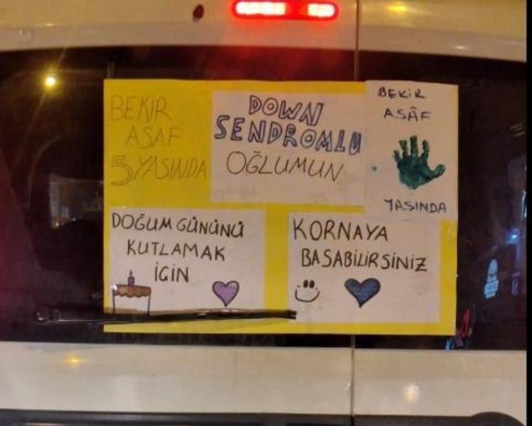 Amasya’da yaşayan Bekir Asaf Çapraz'ın (5) ailesi, hafif ticari aracın arka camına 'Down sendromlu oğlumun doğum gününü kutlamak için kornaya basabilirsiniz' yazısını asarak şehir turuna çıktı.