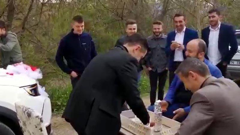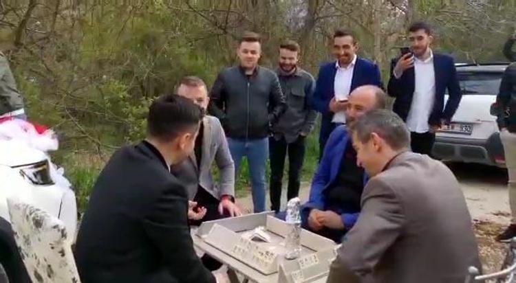 Düğün konvoyunun önünü kesip, damada okey oynattılar
