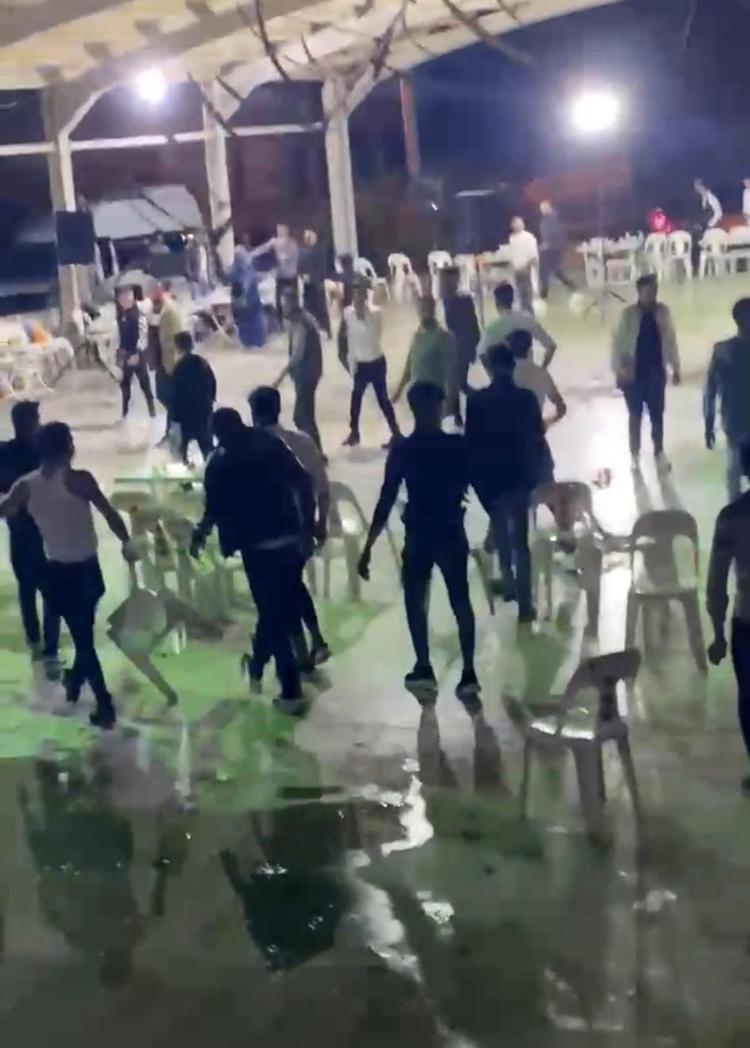 Antalya’nın Serik ilçesinde düğünde yabancı uyruklu iki grup arasında kavga çıktı. Cep telefonuyla kaydedilen görüntülerde, iki grubun sandalyeleri birbirine fırlatarak yumruk yumruğa kavga ettiği anlar yer aldı.