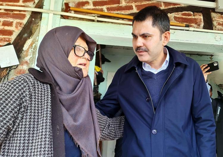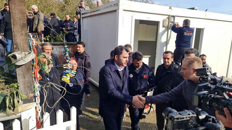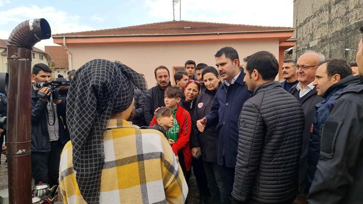 Bakan Kurum, ilk olarak Cumayeri ilçesine bağlı Taşlık köyünde yıkım kararı verilen evlerin sahipleriyle görüştü.