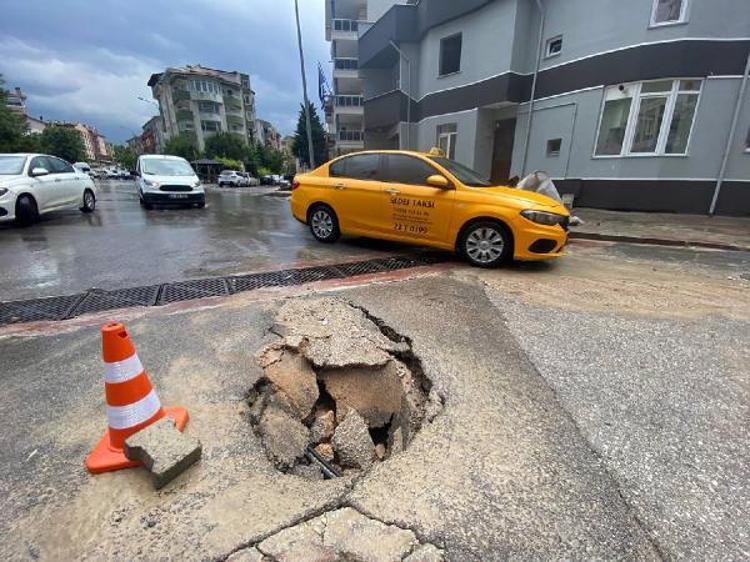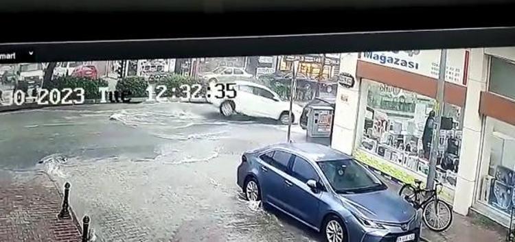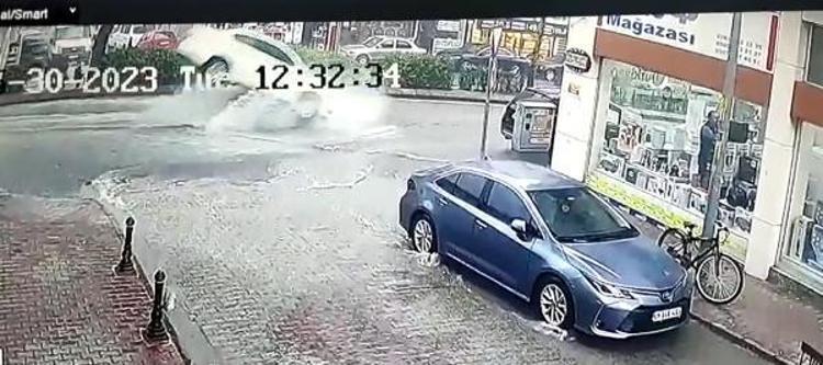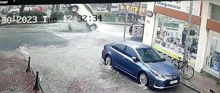 Kentte bir araç sürücüsü, suyla kaplı yolda kanalizasyon çukurunu görmeyip kapağa çarptı.