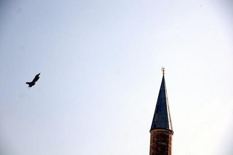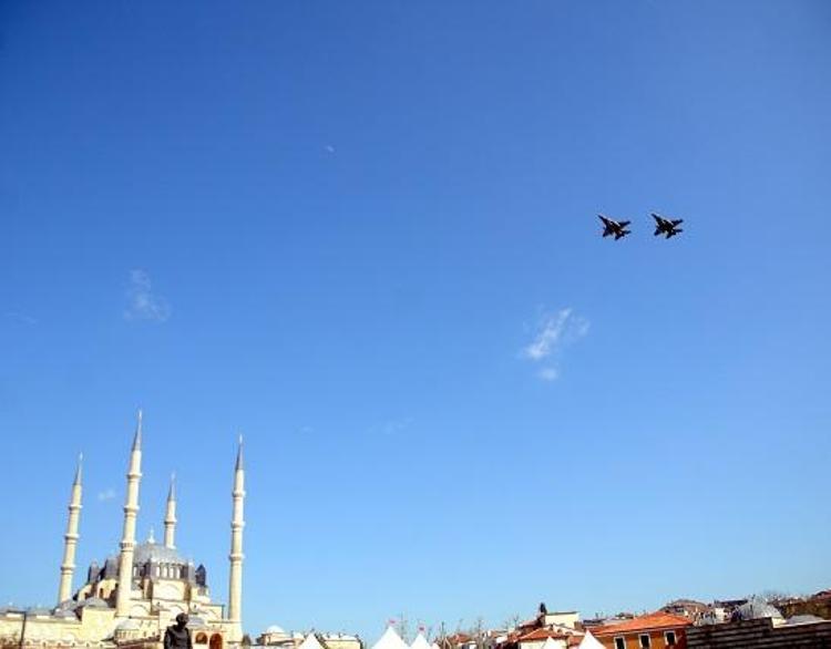 Edirne Valiliği’nin saatler öncesinden duyurduğu prova uçuşu sırasında iki F-16, saat 15.00 sıralarında Selimiye Camisi Meydanı'ndan geçti.