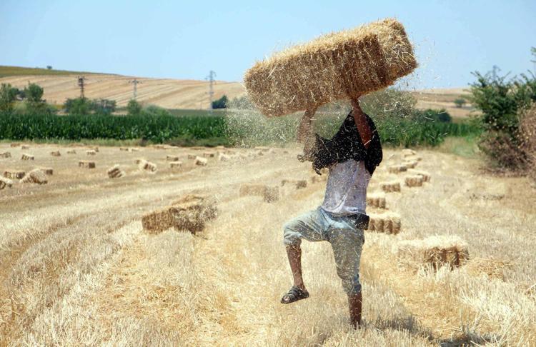 Edirne'de buğday hasadının tamamlandığı tarlalarda, balya işçilerinin zorlu mesaisi başladı. İşçiler, buğday saplarının dönüştürüldüğü 25 kiloluk balyaları, 35 ile 40 derece arasında seyreden kavurucu sıcakta taşıyarak, evlerine ekmek götürmeye çalışıyor.