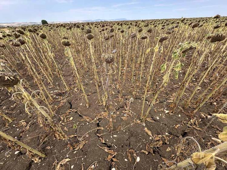 Ayçiçeklerinin kuraklıktan şiddetli etkilendiğini dile getiren Sancakçavuşu, “Şu an ayçiçeklerinin bu halde olması yüzde 100 kuraklık. Biz ayçiçeğini kışın daha erken dönemleri alıp da ekmeye başlıyorduk, kış yağışlarından biraz daha faydalanalım diye. Bu sebepten biraz daha hasat geriye çekiliyordu. Fakat hasat tarihimiz yine 20 Ağustos’a kadar uzayabiliyordu. Ayçiçeği kendini döllüyordu, boyuna, kendi genetiğine ulaşıyordu. Fakat biz ne kadar erken eksek de temmuz sıcaklığının çok yüksek olması ayçiçeğinin kendini dölleme ya da kendi yaşam faaliyetlerini geliştirme durumunda hiçbir olanak vermiyor ve şu an halimiz bu. Ayçiçeğinin normalde ortalarında da tane olması gerekirken sıcaklıktan dolayı, kuraklıktan dolayı ayçiçeği kendini bırakıyor, salıyor ve hasat edilecek haldeymiş gibi gösteriyor. Aslında ayçiçeği şu an olmadı. Sadece susuzluktan dolayı öldü” diye konuştu.