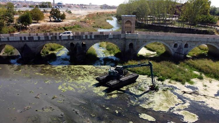 Edirne'de kuraklık nedeniyle otla kaplanan Tunca Nehri temizleniyor