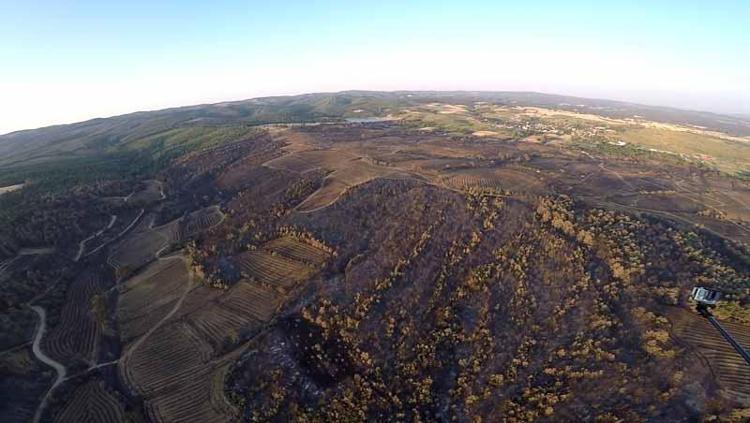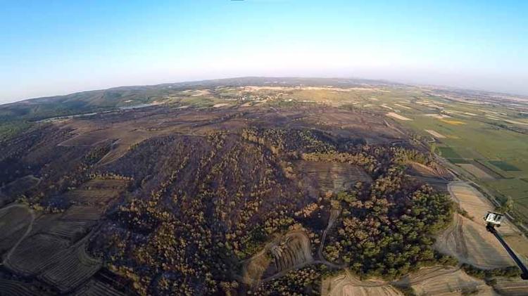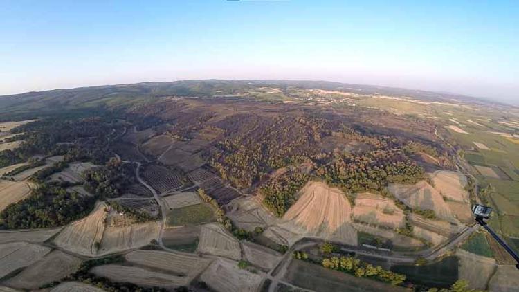 Yangında zarar gören alanlar, paramotor pilotu Yılmaz Özkaya tarafından havadan görüntülendi. Görüntülerde, ormanın tamamen yanarak siyaha büründüğü görüldü.