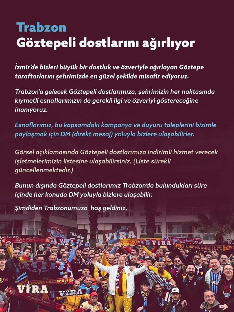 Trabzonspor taraftar grubu VİRA, futbol tribün kültüründe özlenen centilmenlik ruhunu yansıtmak için örnek dayanışma kampanyası başlattı. İzmir deplasmanında gördükleri misafirperverliğe anlamlı karşılık veren VİRA, Trabzon esnafıyla görüşüp, Göztepeli taraftarlara özel indirim anlaşmaları sağladı. Trabzonspor-Göztepe karşılaşması için kente gelecek ‘Göz Göz’lü taraftarlar, anlaşmalı lokanta ve restoranlardan yüzde 50’ye varan indirimlerden faydalanabilecek.