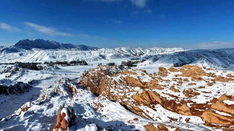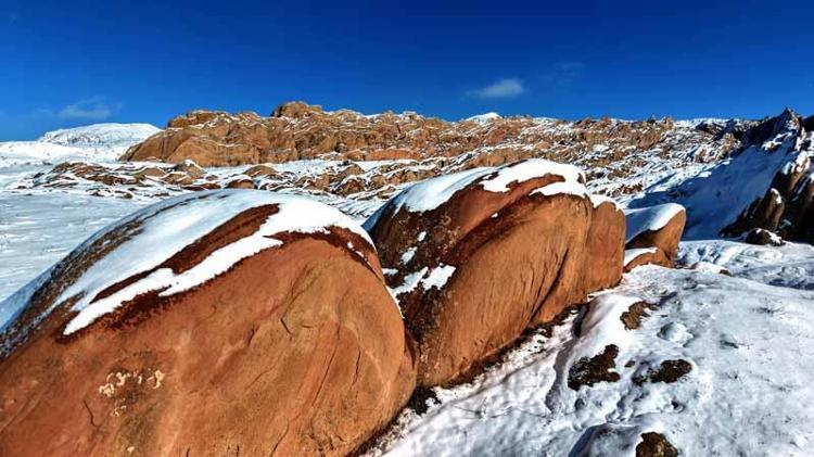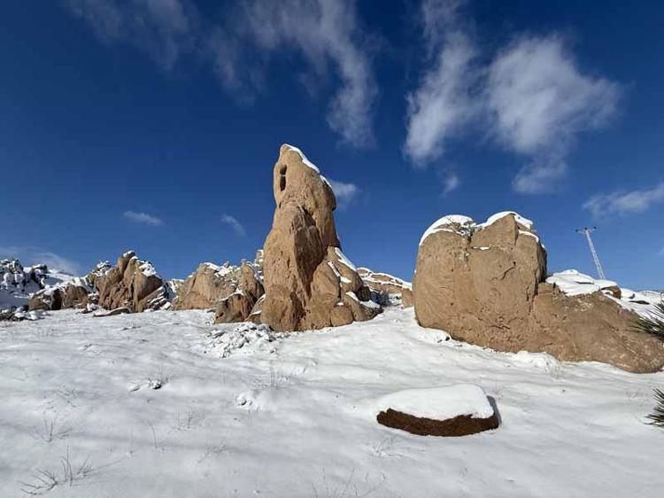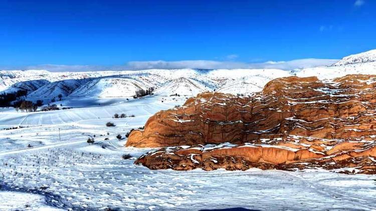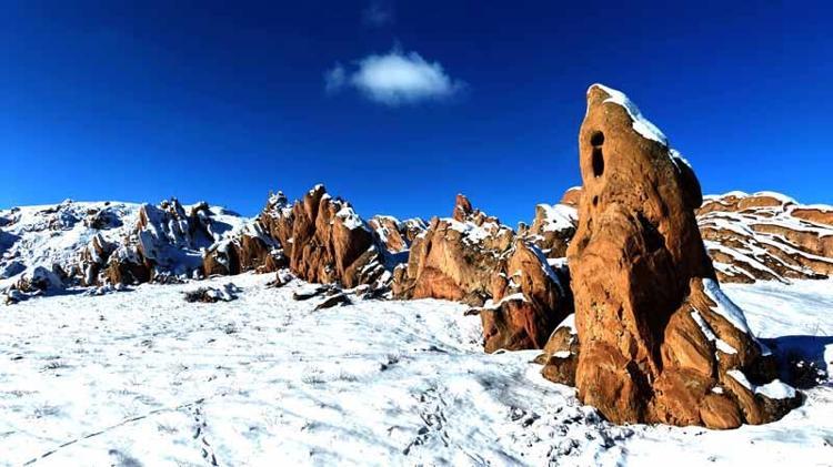 Kar yağışı ile geniş bir alanı kaplayan kayalıkların yüzeyinde oluşan beyaz örtü, kızıl zeminle birlikte güzel görüntüler oluşturdu.