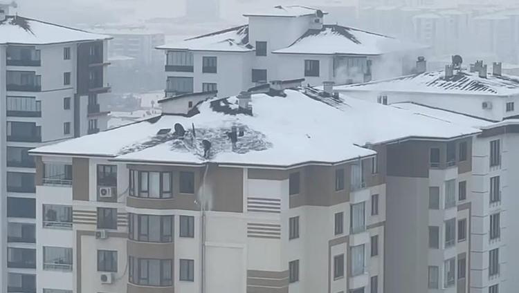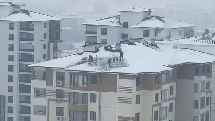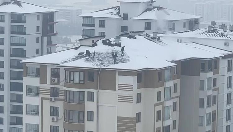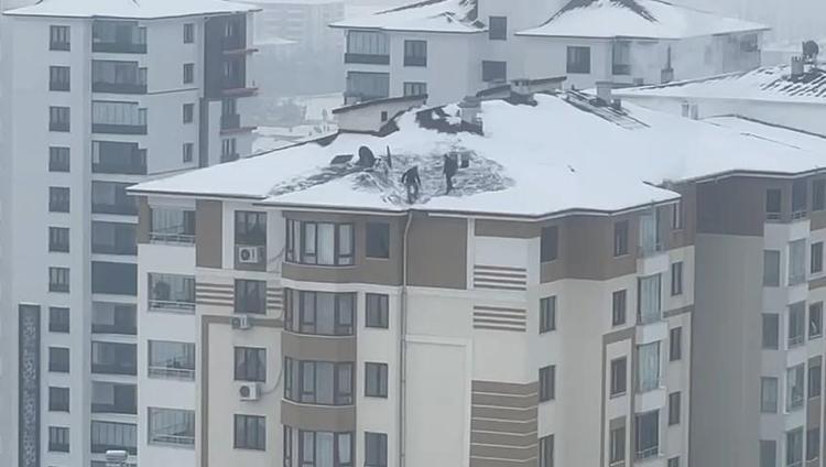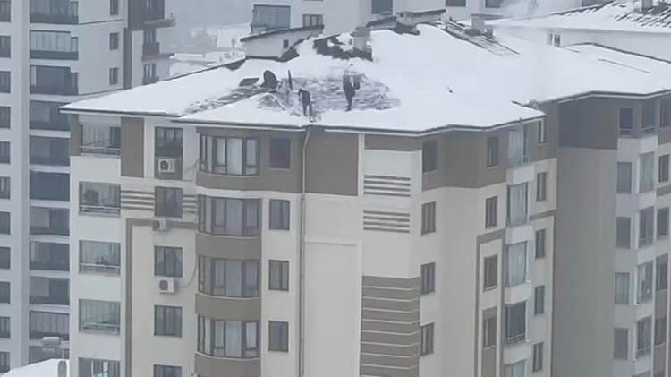 Kentte geçen hafta etkili olan kar yağışının ardından donla birlikte çatılarda biriken kar kütleleri tehlike oluşturmaya başladı. 2 kişinin hiçbir güvenlik önlemi almadan, 10 katlı binanın çatısındaki karı küreklerle temizlediği anlar cep telefonu kamerasıyla kaydedildi.