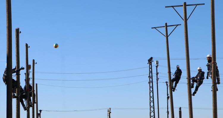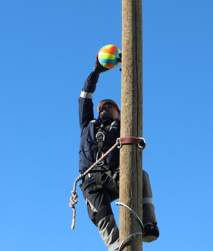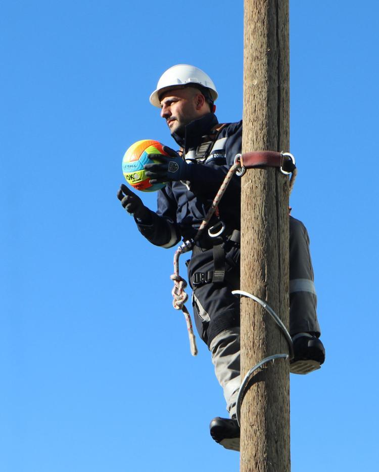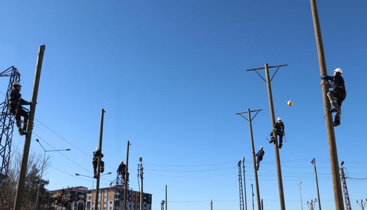 Erzurum’da elektrik işçileri, zorlu kış şartlarına uyum sağlamak için eğitim alıyor. Eğitim sahasında antrenman yapan işçiler, tırmandıkları direklerde voleybol oynayarak dengede kalma becerisini artırıyor.