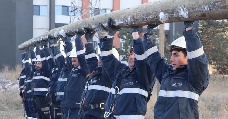 Doğu Anadolu Bölgesi'nde 7 ile elektrik dağıtım hizmeti veren Aras EDAŞ, zorlu kış şartlarında hizmet verecek olan personelini eğitime aldı. Ağırlaşan hava şartları, ulaşım zorlukları ve arazi koşulları göz önünde bulundurularak, arıza ve bakım ekiplerinin yetkinliğini artırmaya yönelik kapsamlı bir eğitim düzenlendi. Yüksek gerilim hatlarında güvenli ve etkin müdahale kabiliyetini artırmak amacıyla yüksekte çalışma parkurları kuruldu. Antrenman sahasında ısınma hareketleriyle eğitime başlayan elektrik işçileri, daha sonra tırmandıkları direkler üzerinde voleybol oynayarak denge, koordinasyon ve güvenli hareket kabiliyetini geliştirmek için çalıştı. Bakım ve arıza süreçlerinde dron destekli kontrolleri de yaygınlaştıran kurum, erişimi zor bölgelerdeki hatları çok daha kısa sürede inceleyerek çözüme kavuşturmayı hedefliyor.