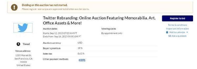 ABD merkezli çevrimiçi müzayede sitesi Heritage Global Partners web sitesinde açık arttırma gününe kadar tanıtıma sunulan 584 parçanın arasında Twitter’ın eski logosu kuş modelinde bir sehpa, neon ışıklarla yapılmış kuş logosu, ofis mobilyaları, müzik aletleri, ofis mutfak aletleri ve beyaz eşyaları, sanat eserleri ve ofis binasının üstündeki büyük mavi kuş logoları bulunuyor.