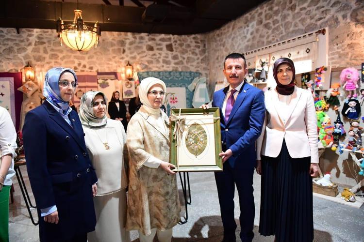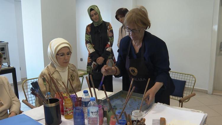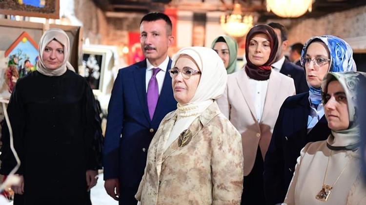 Ankara Vali Yardımcısı Elif Nur Bozkurt'tan sergideki eserlerle ilgili bilgi alan Emine Erdoğan, ürünleri yapan sanatçılarla da sohbet ederek, fotoğraf çektirdi. Daha sonra cam, takı, dokuma ve misafir sanatlar atölyelerini ziyaret eden Erdoğan, ebru sanatından manzara tablosu yapan Sevim Sağdıç'ın çalışmasını izledi. Erdoğan, sanatçı Neriman Şahin'in yaptığı yağlı boya tablonun küçük bir bölümünü boyadı. Ziyaret sonrası Vali Vasip Şahin, Emine Erdoğan'a ağaç yakma sanatıyla yapılan portresini ve Ankara keçisinden elde edilen tiftiğin dokunmasıyla oluşturulan şal hediye etti.