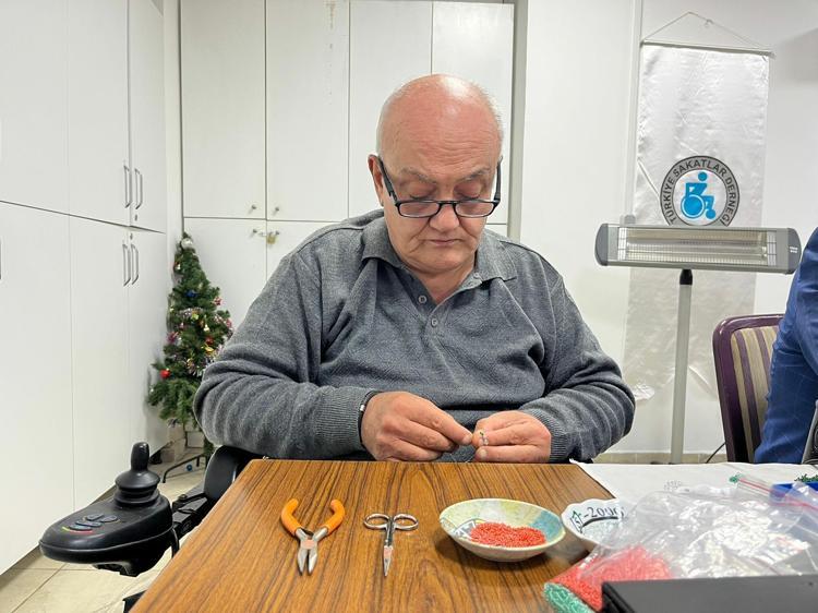 Kas hastalığı olan ve musküler distrofi tanısı nedeniyle tekerlekli sandalye kullanan Murat Yıldırım (54) da "12 yıl önce bocce sporu yaparken Metin Çınar ile tanıştık. Takı tasarım kursuna geldim ve ilk kez boncuk alıp, işleme yaptım. Bileklik, kolye gibi pek çok ürün yapabiliyorum. Aile bütçesine de katkı sağlamaya çalışıyoruz. İlk bakışta boncuk işlemek sıkıcı gibi geliyor ama yapmaya başladığınızda hem el becerisi gelişiyor hem de insanı sakinleştiriyor. Öğretmenimiz bize büyük bir sabırla öğretti. Bu kadarını yapabileceğimi ben de bilmiyordum" dedi.