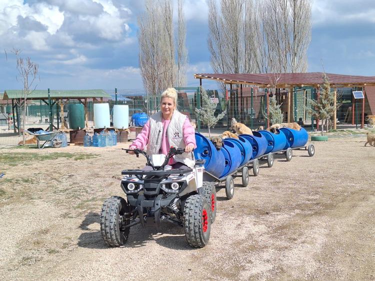 Ankara'nın Gölbaşı ilçesinde kurduğu bakımevinde engelli köpeklerin bakımını üstlenen Buket Özgünlü (36), yürüme güçlüğü çeken hayvanlar için boş varillerden tren yaptırdı. Özgünlü, engelli hayvanları her gün trenle gezdiriyor.