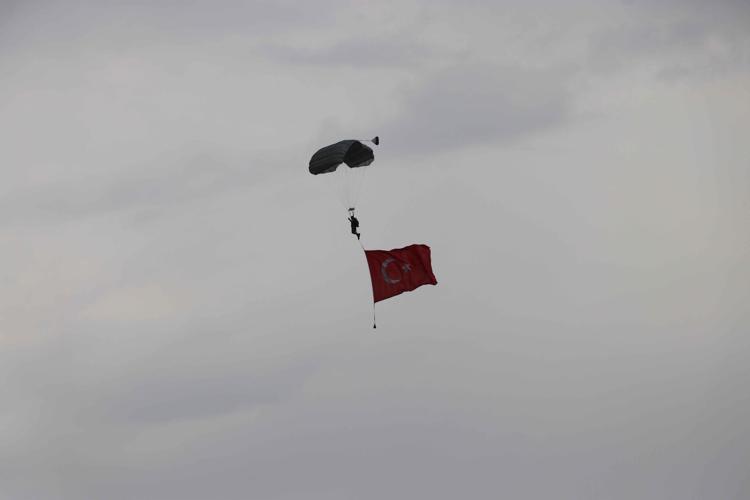 Kara Kuvvetleri Komutanlığı'na bağlı 1'inci Komando Tugayı Komutanlığı tarafından düzenlenen ve 13 ülke askerinin fiilen katıldığı 'Erciyes-2025' tatbikatında; Türk bayrağı ile paraşütle atlayan Kayseri 1'inci Komando Tugay Komutanlığı'nda görevli Piyade Astsubay Kıdemli Başçavuş Fatih Küçükkonuklar, 1974 yılında Kıbrıs Barış Harekatı'nda destanlar yazan paraşütçülerin yuvasında görev yapmaktan onur duyduğunu belirterek, "1995 yılında ilk atlayışımı yaptım. Bugüne kadar 4 bin 836 atlayış yaparak, rekora imza attım. Her atlayışta hala ilk günkü heyecan ve gururu hissederek, Türk Silahlı Kuvvetleri'nde görev yapmanın haklı gururunu yaşıyorum. Bugün Erciyes-2025 Tatbikatı kapsamında şanlı bayrağımızı gökyüzünde dalgalandırmak bana nasip oldu. Bu görev hayatım boyunca unutmayacağım gurur vesilesidir" diye konuştu.