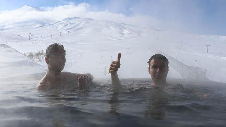 Erciyes Kayak Merkezi’nde eksi 10 derecede sıcak havuza giriyorlar