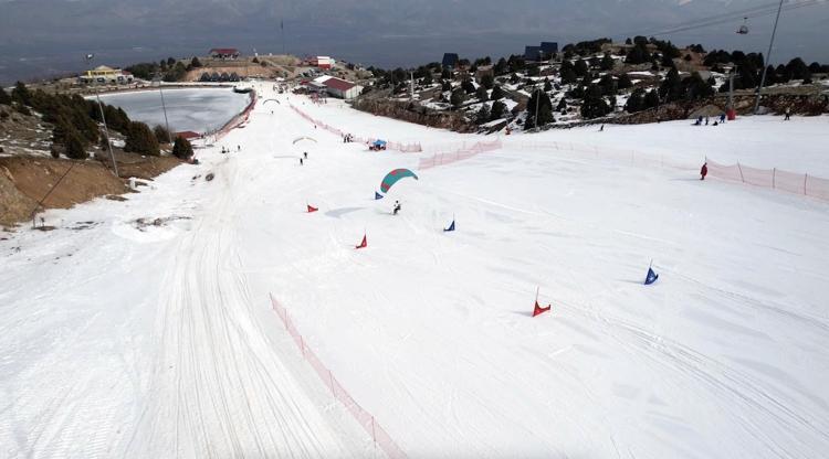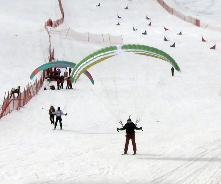 Kayak merkezinin 2 bin 970 metre yüksekliğindeki zirvesine çıkan sporcular, paraşütlerini takıp kaydı. Saatteki hızları 70 kilometreye kadar çıkan sporcular, ilgiyle izlendi.