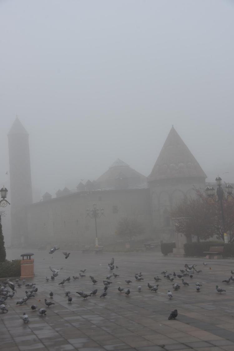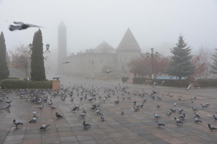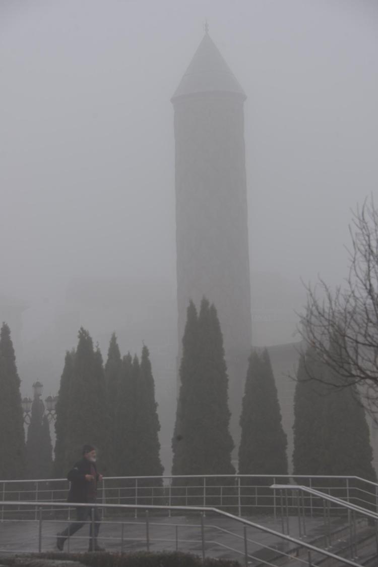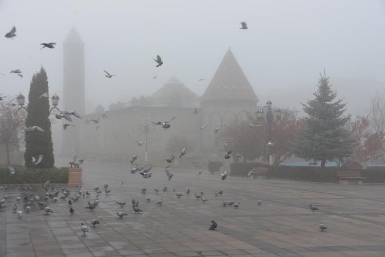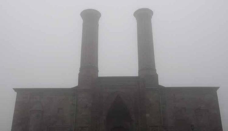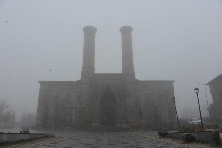 Erzurum'da etkili olan sis, fotoğraflık görüntüler ortaya çıkardı. Çifte Minareli Medrese, Erzurum Kalesi, Yakutiye Medresesi ve kuşların çatısına konduğu Lalapaşa Camisi de sisle kaplandı.
