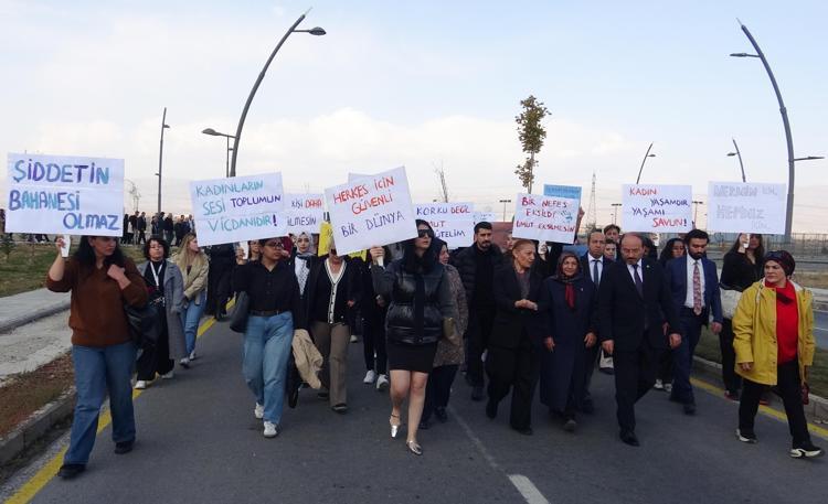 ETÜ kampüsündeki Gelin Paşa Camisi önünde, çoğunluğu kadın yaklaşık 150 kişi toplandı. AK Parti Milletvekili Fatma Öncü, ETÜ Rektörü Prof. Dr. Bülent Çakmak'ın da destek verdiği yürüyüşte, kadına yönelik şiddete tepki gösterildi. 'Şiddetin bahanesi olmaz', 'Herkes için güvenli bir dünya', 'Nermin için... Hepimiz için...', 'Öldürebildiğin kadar değil, sevebildiğin kadar insansın' yazılı dövizler taşıyan katılımcılar, ETÜ rektörlük binasına kadar yürüdü.