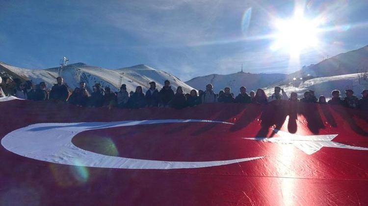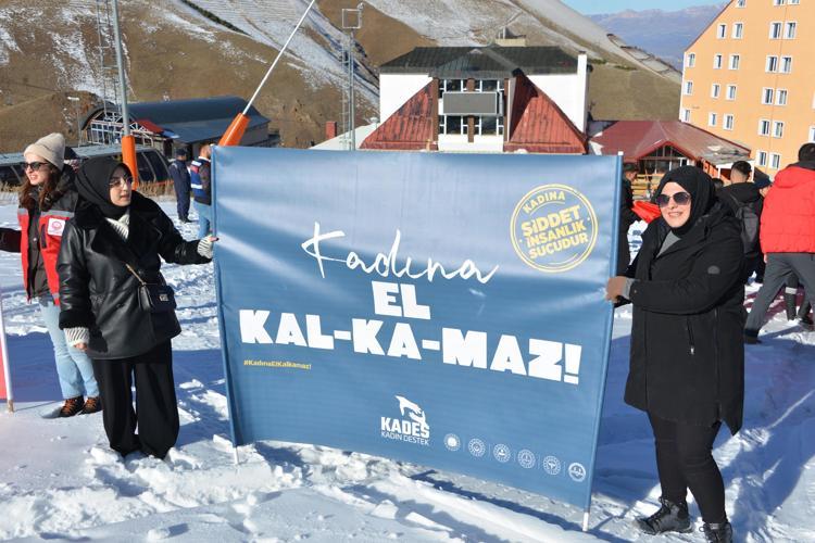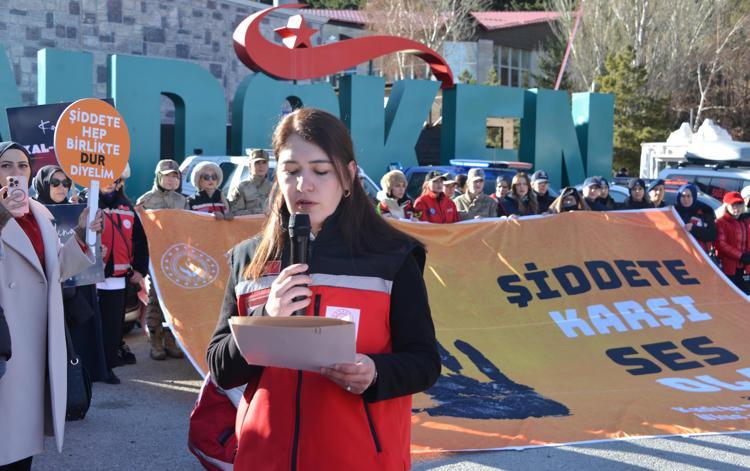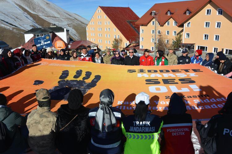 Erzurum'da Palandöken Kayak Merkezi'nde, kadına yönelik şiddet olaylarına tepki için 'Şiddete karşı tek yürek' yürüyüşü düzenlendi. Çoğu kadınlardan oluşan grup, Türk bayrağı açtıkları Palandöken'de 'Şiddet karşı ses ol' pankartı ile seslerini duyurdu.