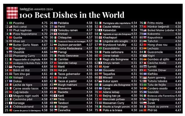 Öte yandan TasteAtlas'ın listesine; 37'nci sırasında İskender kebap, 38'inci sıradan mantı, 60'ıncı sırasından döner, 70'inci sırasından Adana kebap, 72'nci sıradan mercimek çorbası, 77'nci sırasında Hünkar beğendi, 89'uncu sıradan tombik döner, 79'uncu sıradan kokoreç girdi. Kokoreç ise listede Yunanistan lezzeti olarak 'kokoretsi' adı ile yer aldı. (DHA)