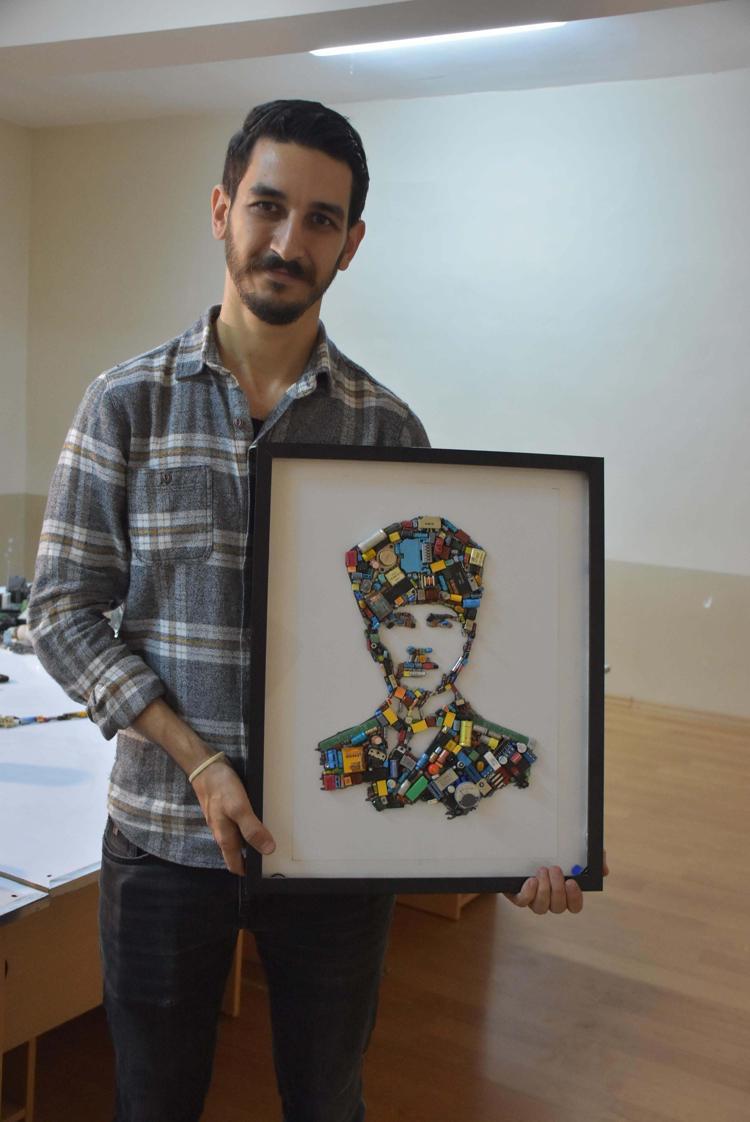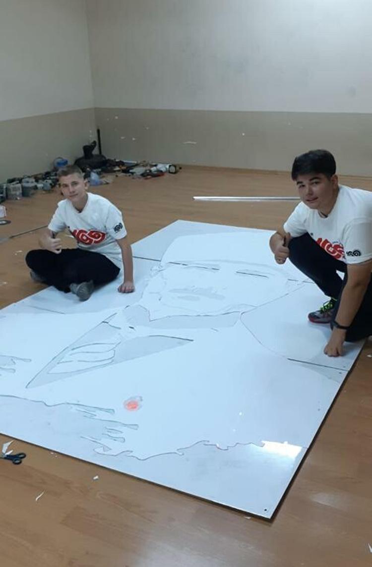 Cumhuriyet'in 100'üncü yıl dönümünde böyle bir çalışmanın içinde yer aldığı için gurur duyduğunu söyleyen Emre Yardımcı da "Çok gururlandım. Bu yıl 29 Ekim'in 100'üncü yıl dönümü. Portreyi yaparken bazen zorlandık bazen de eğlendik. Portreyi ilk önce kağıda çizdik, üzerine malzemeleri yapıştırdık. Defalarca yapıp, bozduğumuz anlar oldu" diye konuştu.