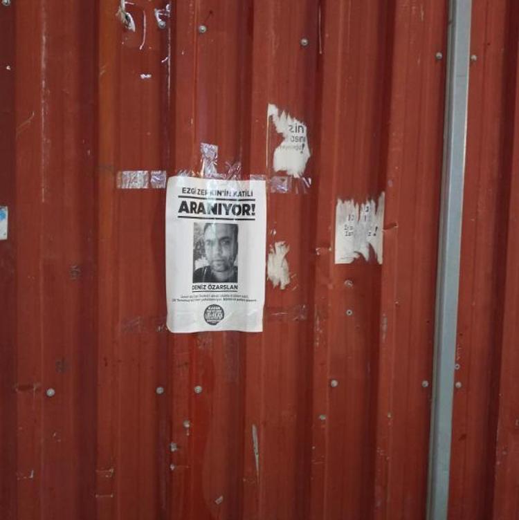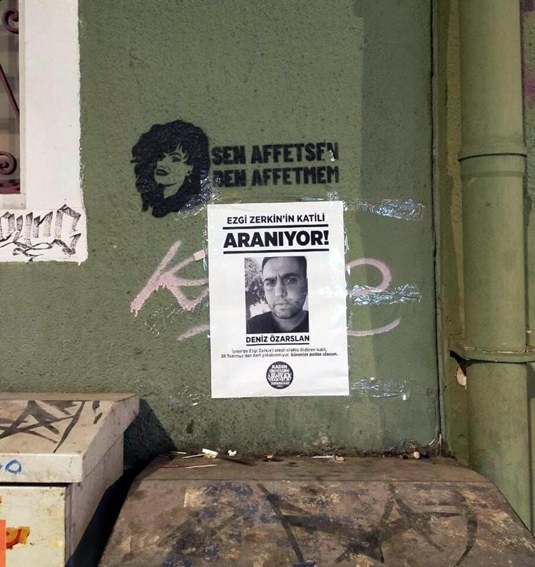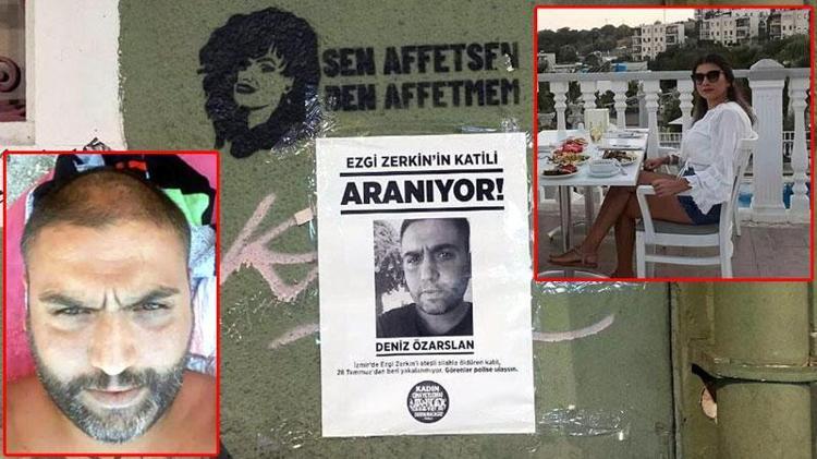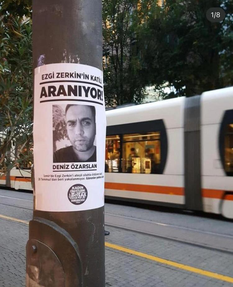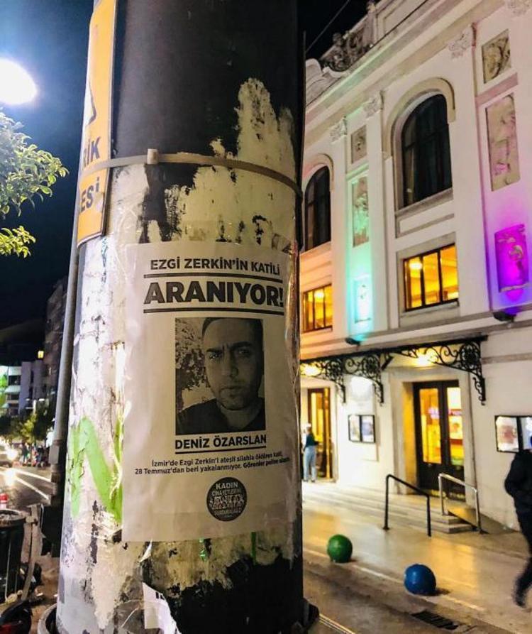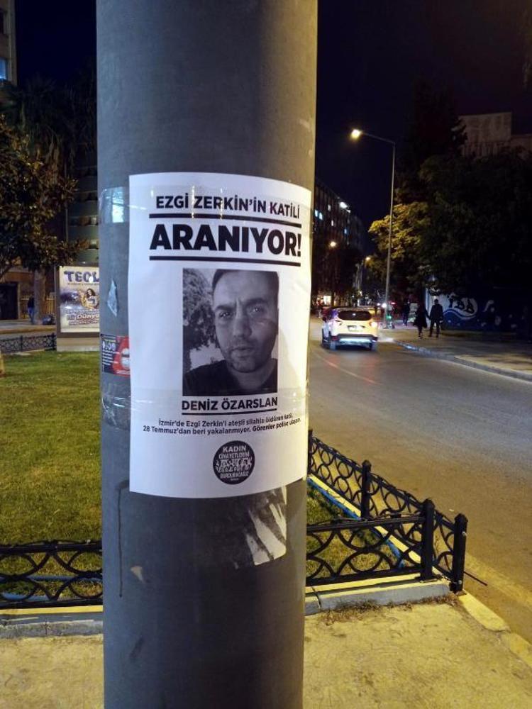 İzmir'in Konak ilçesinde, boşanma aşamasındaki eşi Ezgi Özarslan'ı (31) tabancayla öldürüp kaçan Deniz Özarslan'ın (36) bulunması için kadın dernekleri, aralarında İzmir'in de olduğu 17 şehirde duvarlara ve direklere 'Ezgi'nin katili aranıyor' yazılı afişler yapıştırdı. Ezgi'nin ablası Hazal Zerkin, "İşin bu tarafıyla uğraşmaktan kendi acımı yaşayamadım. Hayat artık bizim için devam etmiyor" dedi.