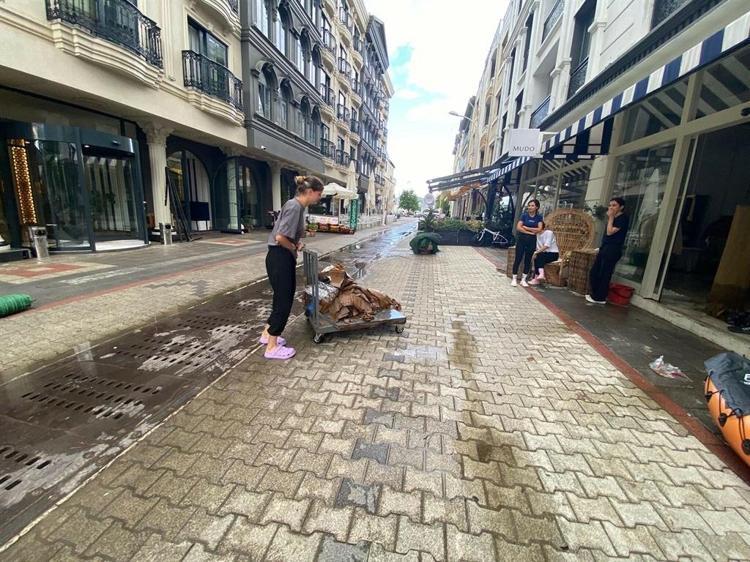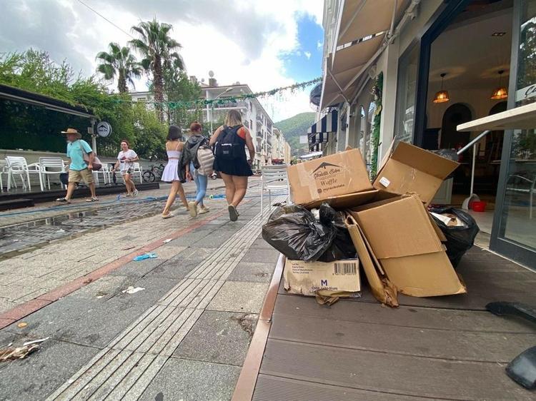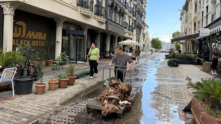 Muğla'nın Fethiye ilçesinde dün etkili olan sağanağın ardından sular altında kalan işletmelerin sahipleri, belediye ekipleri ile birlikte temizlik yaptı.