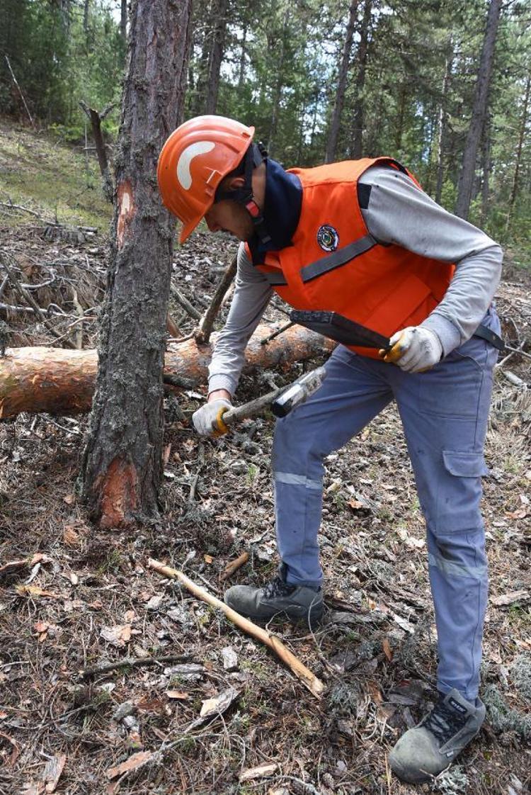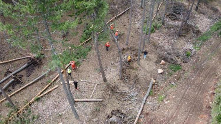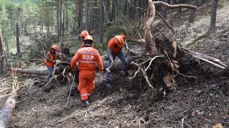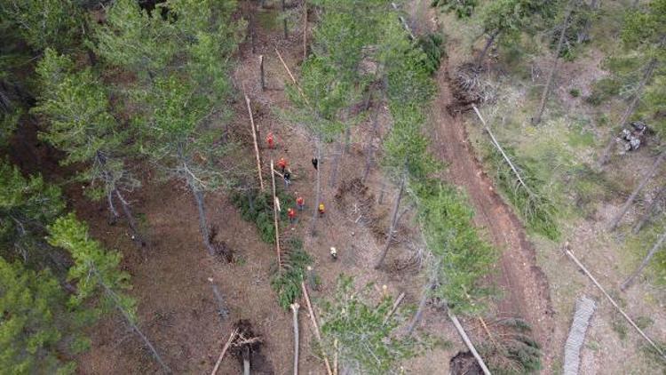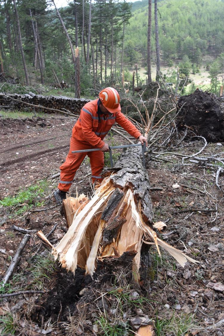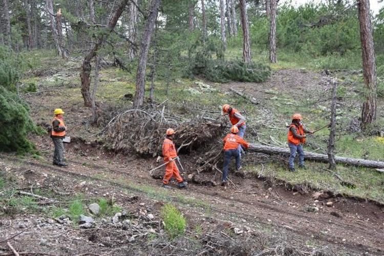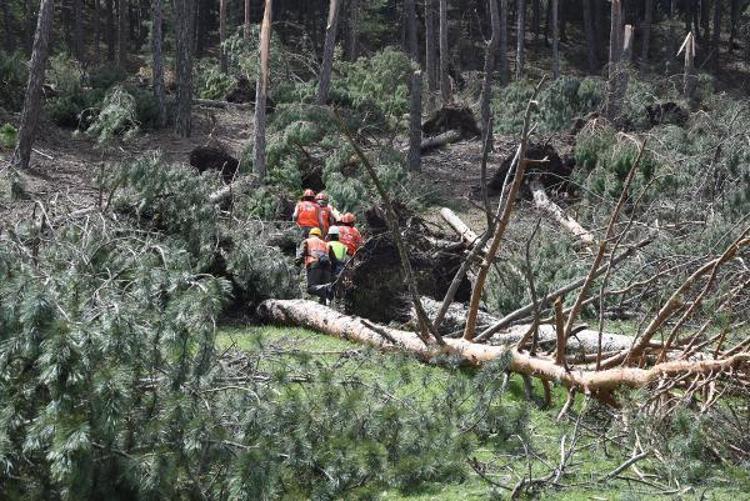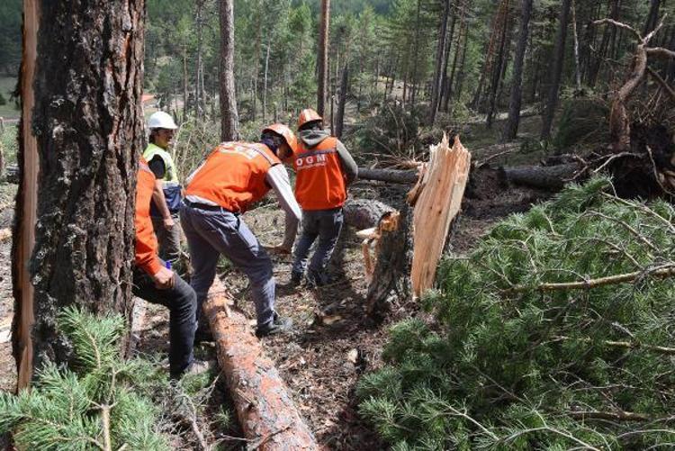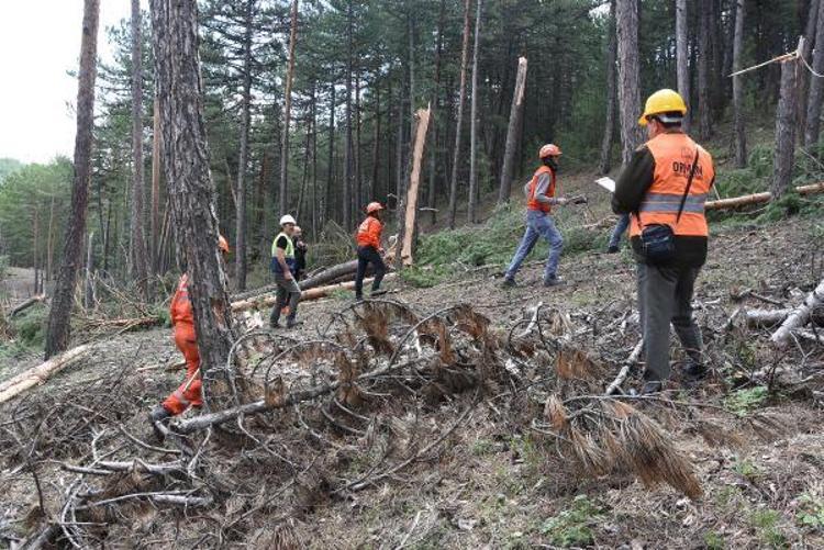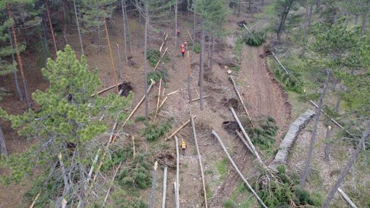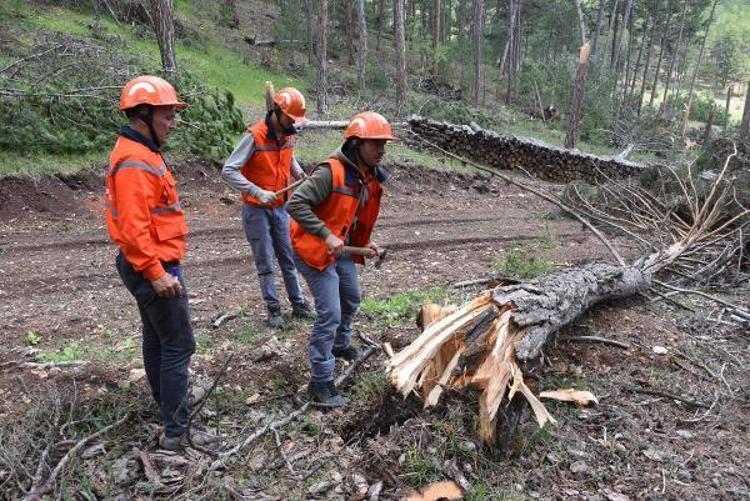 Kırılan ve toprağından ayrılarak devrilen ağaçları tek tek tespit eden ekipler, kesim işlemlerine de başladı. Geyik Alanı Orman İşletme Şefliği ekipleri, 600'ün üzerinde çam ağacının fırtınadan etkilediğini belirledi.