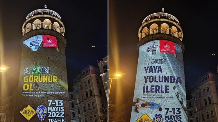 İstanbul'un tarihi simgelerinden Galata Kulesi'ne Trafik Haftası kapanışında "yayalar için 5 adımda güvenli trafik" uyarıları yansıtıldı.