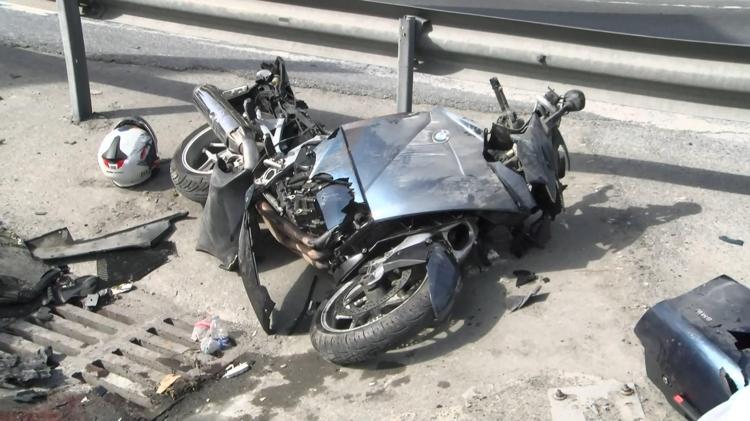 Kazanın etkisi ile sürücüsünün hakimiyetini kaybettiği motosiklet bariyerlere çarptı.
