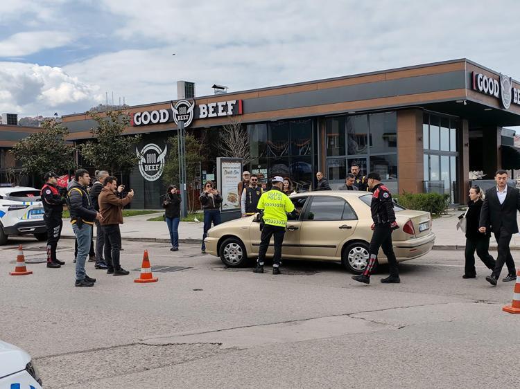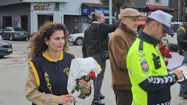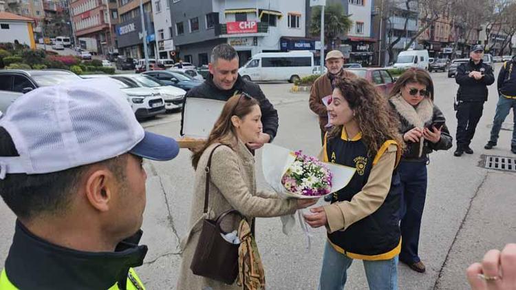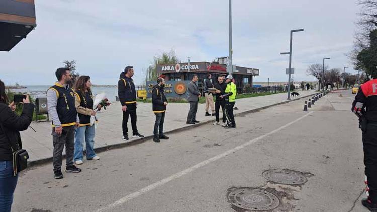 Zonguldak’ta, Karaelmas Gazeteciler Derneği (KGD) üyesi olan basın mensupları, asayiş uygulaması yapan polislerin, Polis Haftası’nı tatlı ikram ederek kutladı. Gazetecilerin hediye ettiği çiçeği alan memurlardan biri, otomobili kontrol ettiği sırada çiçeği elinde tuttu.