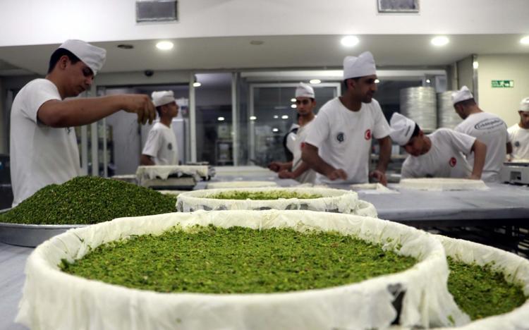 Baklava ustası Ömer Çelebioğulları, bayrama sayılı günler kala siparişlerin beklediklerinden daha fazla olduğunu ifade ederek, üretimin iki kat arttığını söyledi. Gaziantep'te baklavacıların günlük ortalama 30 ton üretim yaptığını ve bunun yoğun talep sonrası 60 tona çıktığını belirten Ömer Çelebioğluları, "Ramazan Bayramı’na sayılı günler kala beklentimizin çok üzerinde bir talep geldi. Şu anda üretim iki kat arttı. Gaziantepli baklavacılar olarak günlük 30 ton olarak ürettiğimiz baklava 60 tona çıkıyor. Elimizdeki analizlere göre şu anda ürettiğimiz baklavaların üçte birini Gaziantep halkına ve şehre gelen turistlere geriye kalan üçte ikisini ise yurt içi ve yurt dışına gönderiyoruz. Yurt içine yaptığımız baklavaların 24 saatte ulaşmasını sağlıyoruz. Yurt dışına ise 36 ile 48 saat arasında teslimatını gerçekleştiriyoruz. İyi bir baklava sadeyağ, fıstık ve ustalıktan başlar. Baklava coğrafi işaretimiz. Baklavayı yemeden önce vatandaşların hafif ısıtmaları gerekiyor. Sebebi Urfa, Harran, Antep bölgesinin orijinal sarı yağını kullandığımız için sadeyağın az biraz eritilmesi lazım’’ dedi.