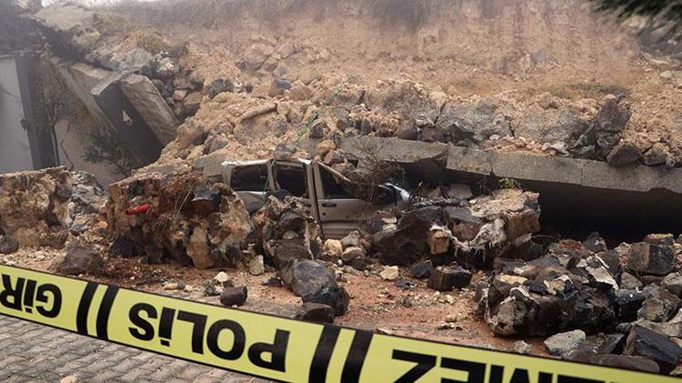 Gaziantep'te dünkü sağanakta yol çöktü, istinat duvarı araçların üzerine devrildi