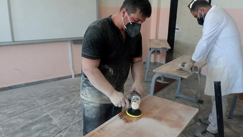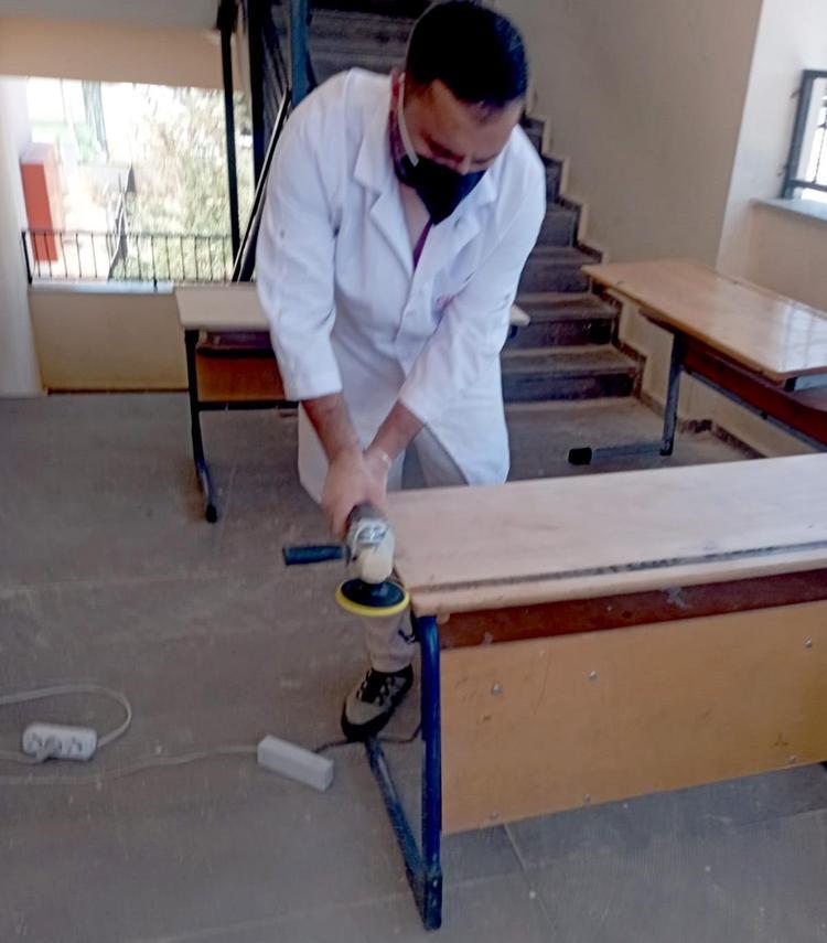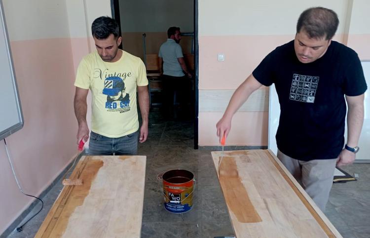 Gaziantep'in İslahiye ilçesindeki Boğaziçi Şehit Ömer Uygun Anadolu İmam Hatip Lisesi’nin öğretmenleri, sıraların tadilatını yapıp, sınıfların ve okulun duvarlarını boyadı.