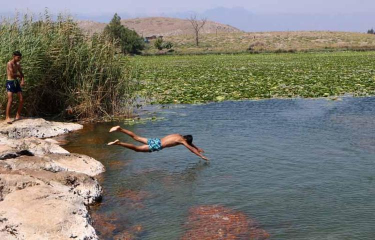 Bazı çocuklar, gölü adeta 'işgal eden' ve yeşile boyayan nilüferlerin arasında serinlemek için yüzüyor.