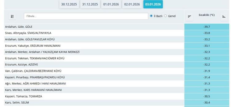 Bu arada gece yapılan ölçümlere göre; Ardahan ve ilçelerinde en düşük sıcaklık şöyle oldu: "Ardahan Merkez -28,7, Damal -23,2, Göle -39,7, Hanak -25,4, Çıldır -30,1."