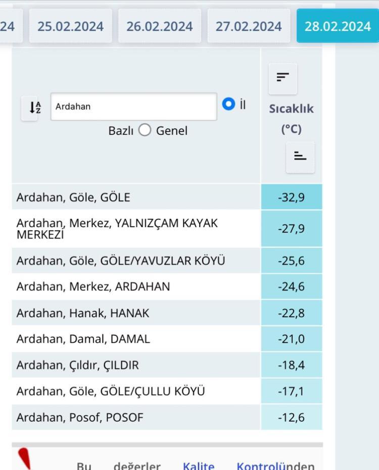 "Ardahan merkez eksi 24.6, Göle eksi 32.9, Hanak eksi 22.8, Damal eksi 21, Çıldır eksi 18.4, Posof eksi 12.6."