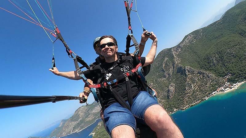 Muğla'nın Fethiye ilçesindeki Babadağ'dan görme engelli İngiliz turist Paul Goodwen (47), tandem yamaç paraşütü ile uçtu.