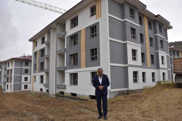 Şu an burada AFAD üzerinden hak sahibi olan ve TOKİ tarafından evlerinin yapılıp teslim edilmesini isteyen köy ve mahallelerden 164 hak sahibinin binalarının yapıldığı yerdeyiz. Şu an burası 85 konutun yapıldığı ve tamamlanmak üzere olan yer. Yaz döneminde kura ile birlikte hak sahiplerine teslim edilecek aşamaya geldi. Şu anda ince işleri devam ediyor. 79 adet ikinci etap olarak ihalesi yapılan ve çalışmalara başlanan bir inşaat alanımız var. Orada da çalışma sürüyor" dedi.