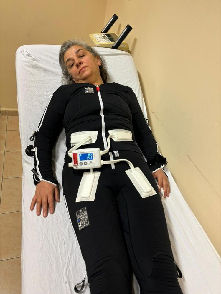 Dr. Yasemin Özel Aslıyüce de 'biyonik giysi' tedavisinin yöntemini anlatarak, "İlk olarak hastamızın her bölgesinin ağrı şiddetini belirleyip cihaza giriyoruz. Cihaz bu bilgilere yönelik bir algoritma içerisinde bir akım belirliyor hasta için. Daha sonra bu akımı hastamıza cihaz yoluyla uyguluyoruz. Yaklaşık 1 saatlik akım bu. Ardından hastamızı ertesi gün, 1 hafta sonra, 1 ay sonra değerlendiriyoruz. Sonuçlarını tekrar cihaza girerek analizini yapıyoruz. Özellikle hastalarımızın uykularındaki ağrı şikayetlerinden kurtulduklarını görüyoruz. Ve ayrıca biz hastalarımızın fonksiyonel performanslarını da değerlendiriyoruz 'günlük yaşamdaki aktiviteleri yapmaları kolaylaştı mı' şeklinde. Uyku ve aktivite ciddi anlamda gelişti hastalarımızda" dedi.