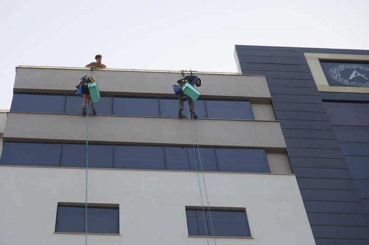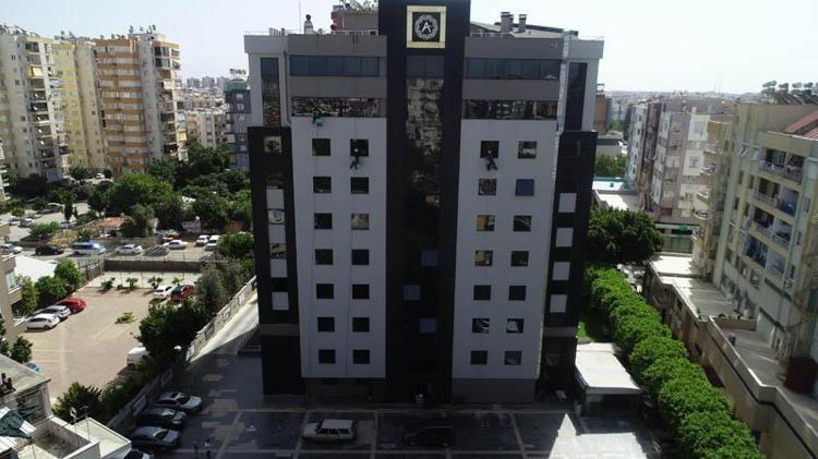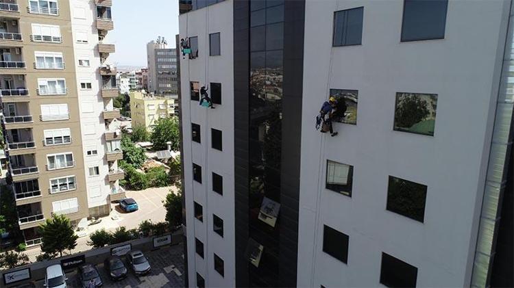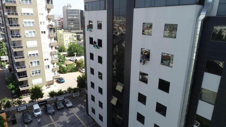 Endüstriyel dağcıların dış cephe temizliğini izlerken oldukça heyecanlandığı gözlenen Mustafa Büyüközer, "Tüm önlemler alınmış olsa bile bu herkesin yapabileceği bir iş değil. Gençleri tebrik etmek lazım. Benim çocuğum bu işi yapmak istese zor onay veririm" dedi