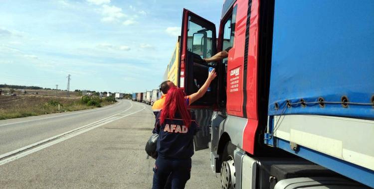 Edirne İl Afet ve Acil Durum Müdürlüğü (AFAD) ekipleri, kuyrukta saatlerce bekleyen TIR sürücülerine kumanya dağıttı. Sürücüler, aldıkları kumanya ile ihtiyaçlarını giderirken, AFAD yetkililerine teşekkür etti.
