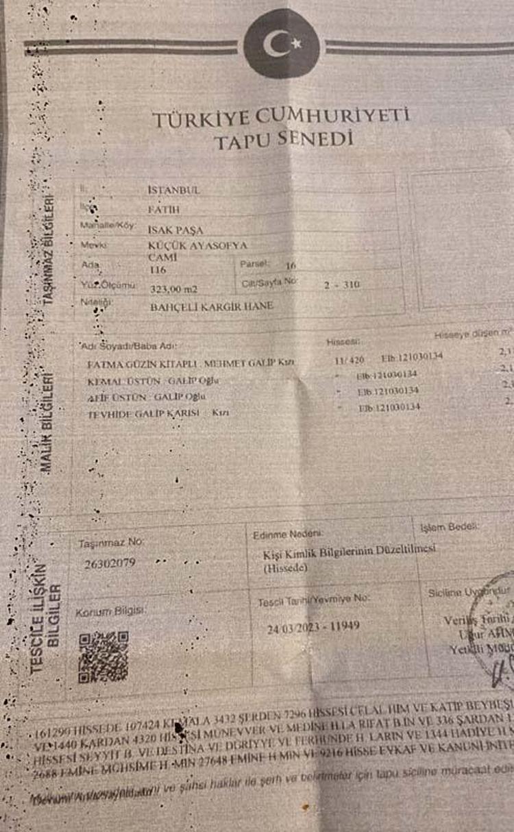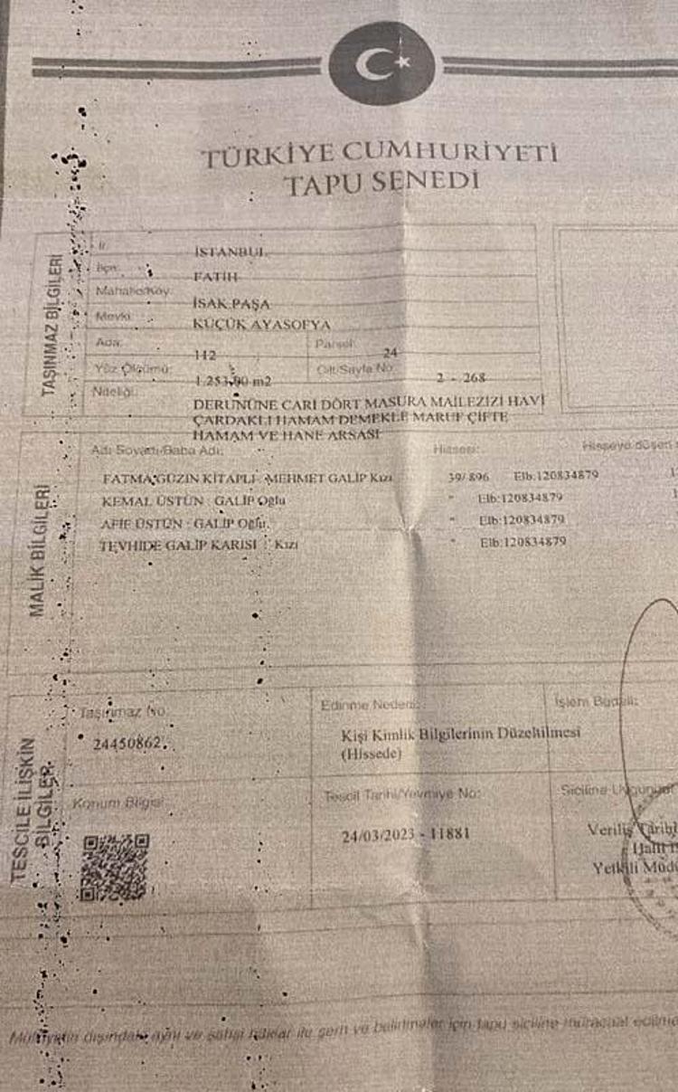 İstanbul'da 2'nci Beyazıt dönemi Darüssaade (Harem Dairesi) ağalarından Hüseyin Ağa'nın, Küçük Ayasofya Camii haziresindeki Çardaklı Hamamı ile yıkılmış konak alanının tapusu, torunlarının 63 yıldır sürdürdüğü hukuk mücadelesi sonunda, 16 hissedar adına 24 Mart 2023 itibarıyla tescil edildi. İki yerin değerinin 7,5 milyon dolar civarında olduğu kaydedildi.