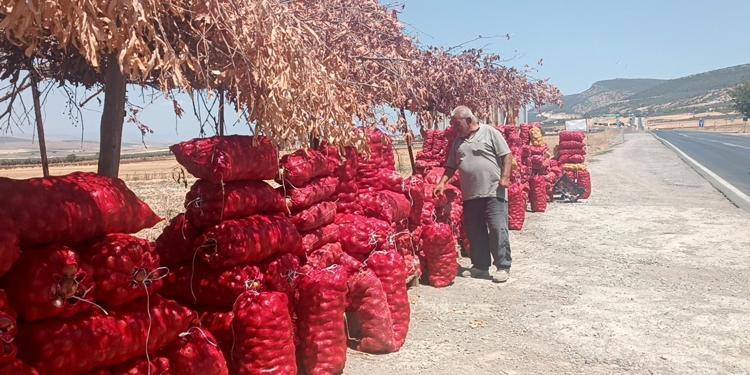 Sakcagözü Mahallesi’nde 15 bin dekar alanda üretimi yapılan ve kuraklık nedeniyle rekoltesi düşen soğanın hasadı devam ediyor. Sofraların vazgeçilmesi olan soğan tarlada 3 liradan alıcı bulurken, yol kenarına kurulan tezgahlarda 12 ile 15 liradan arasında satışa sunuluyor.