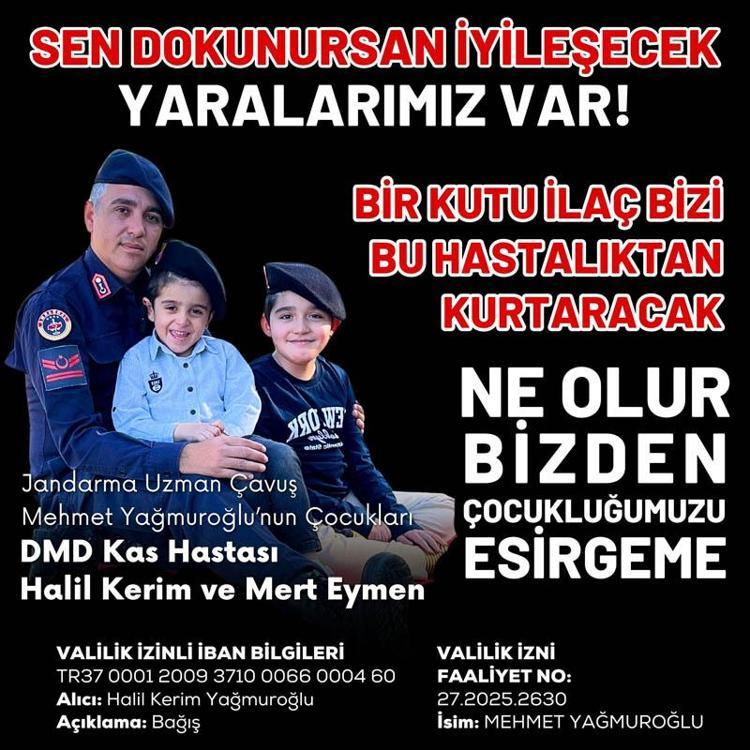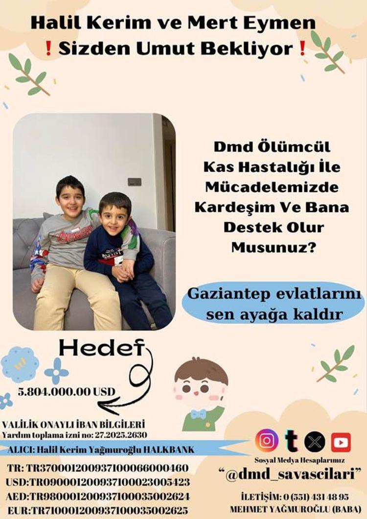 Gaziantep’te, jandarma uzman çavuş Mehmet (34) ve Emine Yağmuroğlu (29) çiftinin çocukları Halil Kerim (9) ve Mert Eymen (4) için 3 yıl önce Duchenne Musküler Distrofi (DMD) teşhisi kondu. Aynı kaderi yaşayan ve tedavileri için 6 milyon dolara ihtiyaç duyulan kardeşler için Valilik onaylı kampanya başlatıldı. Kampanyada henüz yüzde 1 seviyesine ulaşıldığını söyleyen Emine Yağmuroğlu, "İki evladımı da kaybetmek istemiyorum. Herkesten destek bekliyorum" dedi.