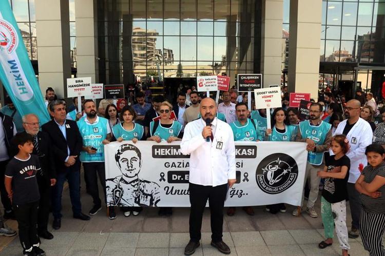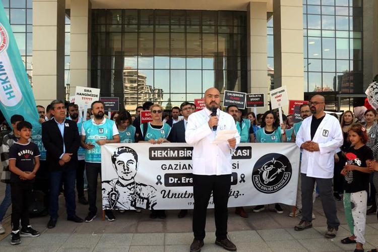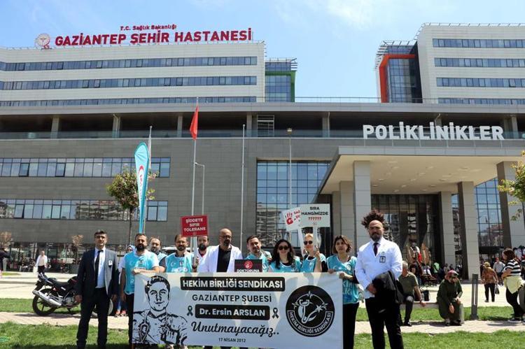 Hasta yakını tarafından 17 Nisan 2012’de uğradığı bıçaklı saldırı sonucu yaşamını yitiren Dr. Ersin Arsan için Gaziantep Şehir Hastanesi önünde ölümünün 12'nci yıl dönümü nedeniyle Hekim Birliği Sendikası tarafından anma töreni düzenlendi.