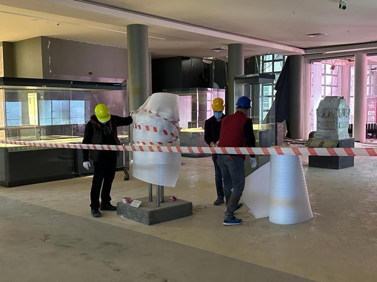 Güvenliği sağladıktan sonra eserlerle ilgili de restorasyon bölge laboratuvarlarımızdan restoratörlerimiz geldi. Çok çalıştılar hepsine teşekkür ediyorum. Tüm vitrinler kontrol edildi ve eserler sağlama alındı, sarıldı.